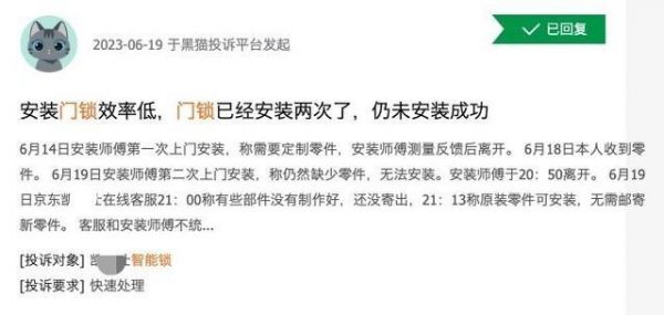 相比于购买,安装过程中的闹心事儿更多,而且花样更集中于“无人安装”“安装失败”。毕竟,换门锁容易换门难。在智能门锁安装过程中,因为门的形状不同,极易出现安装不上的问题,更有甚者直接因为打孔把门给“打坏了”……