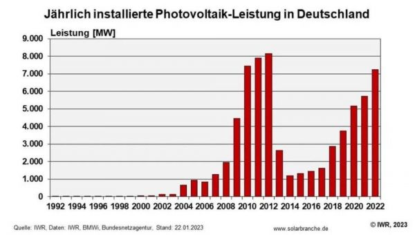 德国过去三十年历年光伏装机量,这里可更直观地看出其直至2022年也没有恢复到2010-2012年巅峰期的7.5-8GW。来源同上。