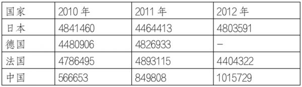 2010-2012年主要国家汽车出口量统计,中国勉强位列前十,日德法三强牢牢占据全球前三,来源:中国汽车工业年鉴。