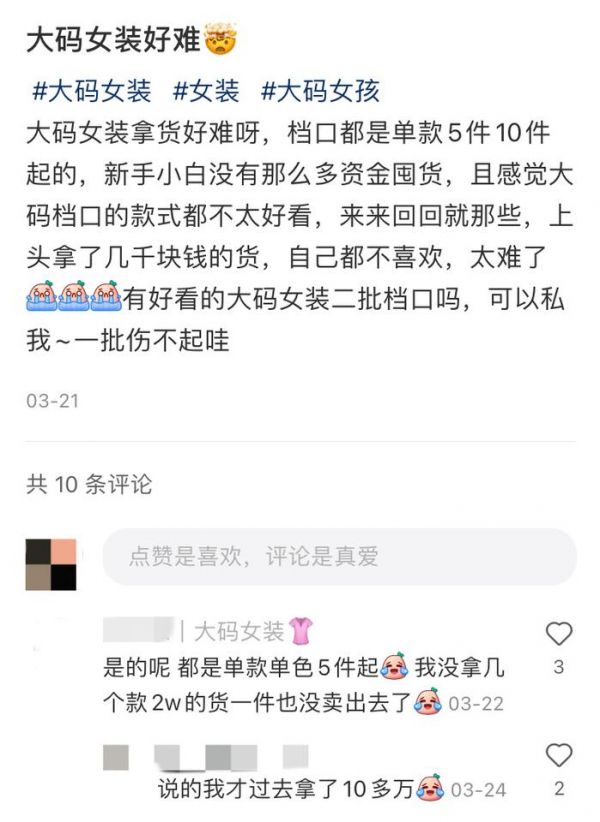 其他店主对于大码女装拿货的吐槽,图源小红书