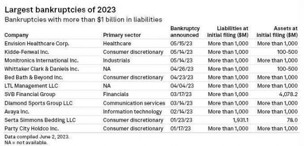 S&P Global分析公司清晰的汇总了前五个月份里因为负债超过10亿美元而申请破产的11家上市公司。