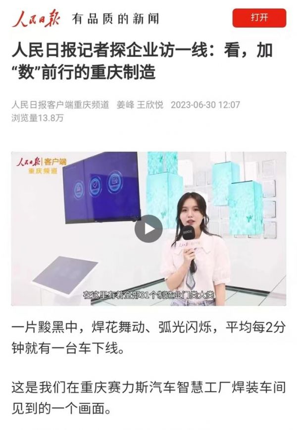近期,赛力斯汽车频频现身中央媒体的重要版面,收获人民日报、新华社、央视新闻等密集关注。在人民日报6月30日刊登的《人民日报记者企业访一线:看,加“数”前行的重庆制造》报道中,对赛力斯汽车4.0智慧工厂的描述占据较大的篇幅,记者深度体验了赛力斯两江智慧工厂的高度自动化、数字化和智能化,全过程见证工业4.0工厂实现从原材料到最终成品的无人化作业。此外,人民日报在近期还刊登了一则手绘长图——《一辆汽车的出生日记》,生动形象地向读者展示了赛力斯汽车行业领先的智能制造能力。