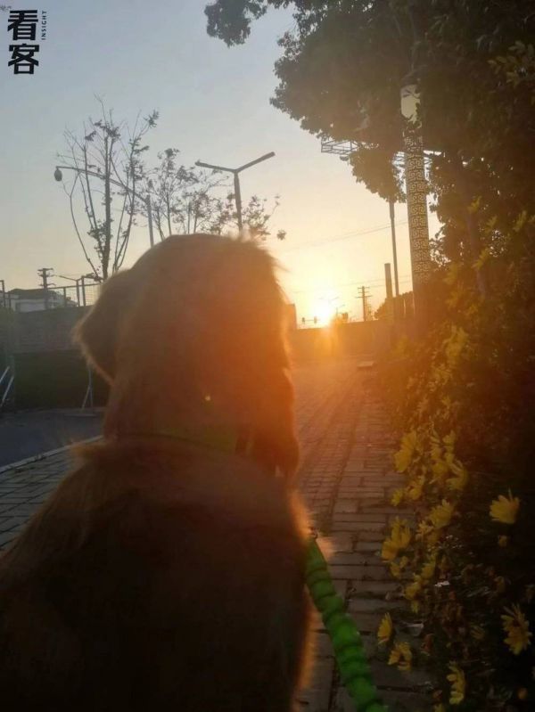 傍晚时遛狗,夕阳和小狗的毛发一样是金灿灿的