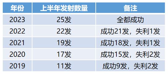 截至6月30日,2023年上半年,我国累计发射运载火箭25发,以全胜成绩收官。其中,以航天一院、八院为代表的“国家队”共计21发,民商火箭公司4发。