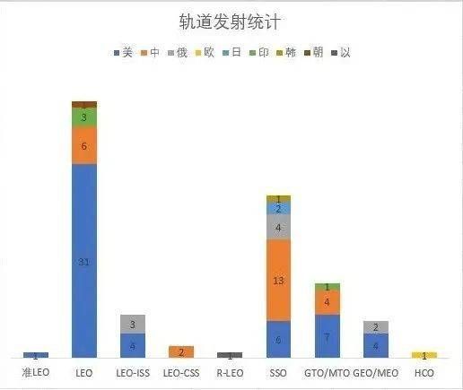 在轨道统计上,全球大多数国家火箭发射的目标为LEO和SSO,其中中美两国还较为关注GTO/MTO。