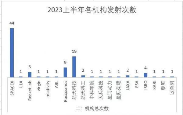 在发射机构统计上,美国太空探索公司(SpaceX)、中国航天科技集团分列发射数量的前两位。其中SpaceX公司上半年共完成火箭发射44次,共发射卫星和航天器1400颗。