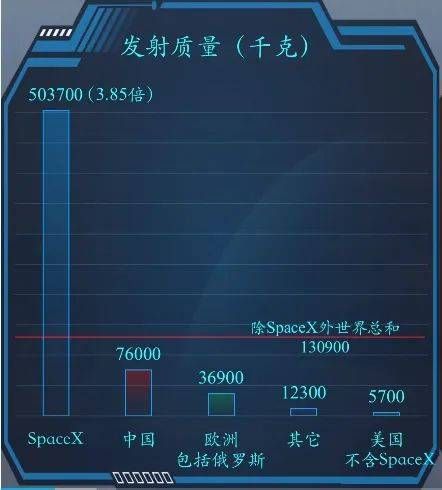SpaceX公司上半年发射的载荷质量约503.7吨,如果再加上其他航天机构发射的5.7吨载荷,美国上半年共发射载荷质量约510吨,是其他国家发射载荷质量总和的近4倍。按此趋势,预计2023年全年,美国总计发射载荷质量有望突破1000吨。
