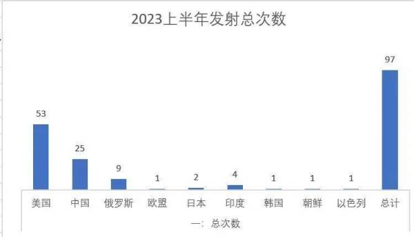 据统计显示,2023年上半年全球总计发射火箭97发。其中美国(53发)、中国(25发)分列前两位,占到全球火箭发射数量的81%。美国上半年进行的53次发射中,49次成功,4次失利;中国上半年进行了25次发射全都成功。
