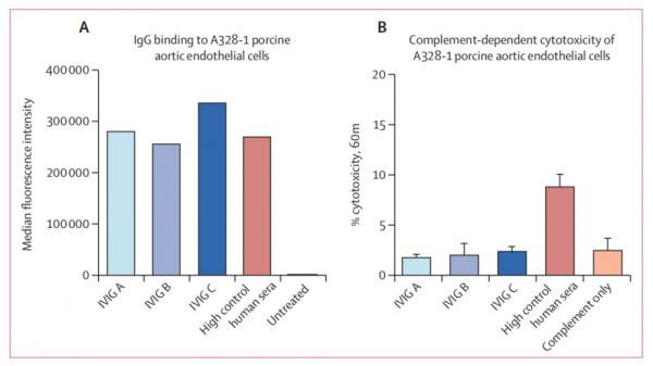 静脉注射免疫球蛋白(IVIG)也可能导致心肌细胞受损。在移植后的第二个月,大卫·贝内特被注射了两次这种药物,以帮助预防感染,这也可能引发针对猪心脏的免疫反应。对于这一点,研究团队发现了针对猪心脏血管内皮层的免疫球蛋白抗体的证据。其中,低丙种球蛋白血症在IVIG给药后和第一次血浆交换期间检测到抗猪异种抗体增加,主要是IgG。术后第56天,他的心内膜活检显示与进行性心肌僵硬一致的纤维化改变。