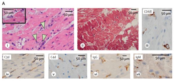 这项研究证实,在移植后的最初几周内,患者的超声心动图显示移植物功能良好,心血管和其他器官系统功能持续,没有出现急性排斥反应的迹象。然而,患者在术后第47天发生舒张性心力衰竭,术后第50天,心内膜活检显示毛细血管受损,伴有间质水肿、红细胞外渗、罕见的血栓性微血管病变和补体沉积。