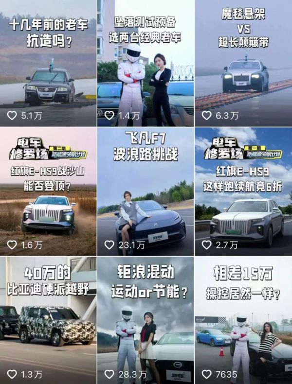据卡思观测,@玩车报告 在抖音发布的视频作品包含了“极限测评”“大事件”“原创试驾”“情怀老车”等多个板块,在这之中,以“极限测评”和“大事件”两个内容系列最为突出。