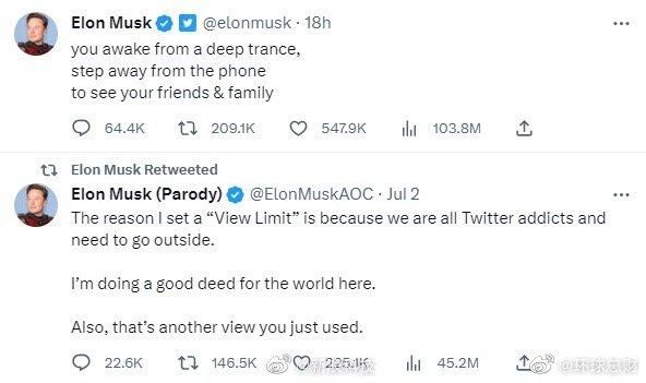 【#马斯克回应限流推特#:离手机远点 多去看看朋友和家人】近日,马斯克限制了免费用户的推特浏览条数。除了自己声称的“限制第三方抓取推特数据”这一理由外,马斯克还转发了一位高仿号的推文,内容是:“我设置推文浏览量限制的原因是因为我们都是‘推特成瘾者’,每天大家都恍惚于网络世界,(所以)我这是在为世界做一件好事。马斯克还发推表示,“大家应该都离手机远点,需要到外面去多进行社交活动,多去看看你的朋友和家人。”根据目前最新的政策,推特的普通用户每天只能浏览1000条推文。