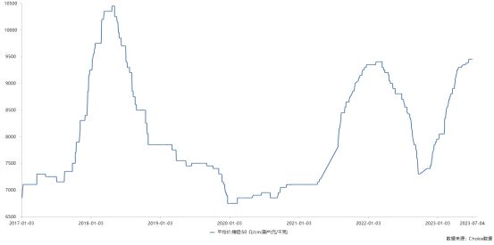 价格方面,近期锗价走强趋势明显,据Choice数据,截至7月4日国产锗锭50 Ω/cm均价为9450元/千克,触及近5年高点。