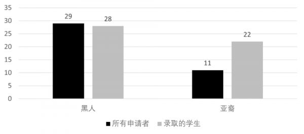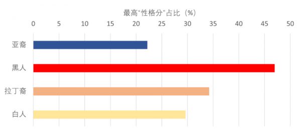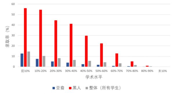 以下图表对比:在学术水平最高档的申请者(前10%)中,不同种族的申请获得最高“性格分”的比例