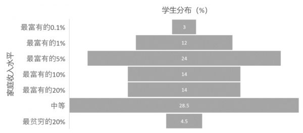 从总体上来看,哈佛大学的学生背景绝大多数是富裕阶级。67%的学生家庭收入为全国前20%,一半以上(53%)的学生家庭收入为全国前10%,更有15%的学生家庭收入达到了全国的前1%。而来自贫穷家庭(收入为全国底端20%)的孩子则只占校园中的4.5%。