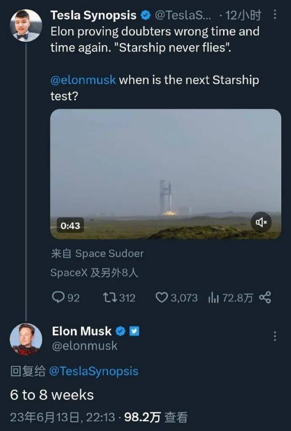 马斯克在回应 SpaceX 发布的一段视频时透露了这一信息。另外,北京时间6月14日,马斯克再次发布推特,表示距离星舰发射还有6至8周的时间,如果按上述信息分析,星舰下一次飞行试验预计在8月份左右。