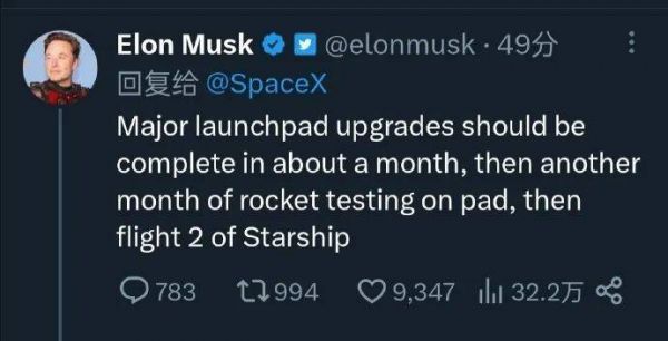 6月14日, 太空探索公司SpaceX首席执行官埃隆・马斯克在社交媒体上表示,该公司计划在6-8周内(两个月内)进行星箭(Stharship)的第二次轨道试飞。