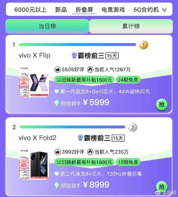 在竖向折叠的产品优势下,又精准看到了用户体验的痛点以及女性用户的实际需求,再加上 5999 元起的售价与常规旗舰相差无几。这也就不奇怪在之前京东 618 手机大盘中,vivo X Flip 干脆拿下了折叠屏手机累计销量第一名的宝座。