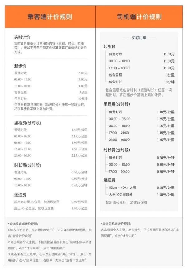 2021年,因抽成过高被8部门约谈后,滴滴公布了平台的收费定价机制。滴滴分时段计价,不同时段的起步价、里程费、时长费各不相同。其中司机分成包含:每笔订单的基础收入、其他收入(乘客支付的动态调价、调度费、感谢费、取消费、春节服务费等,平台支付的空驶补偿等);司机补贴包括:平台发放冲单奖、早晚高峰奖、节日补贴等。