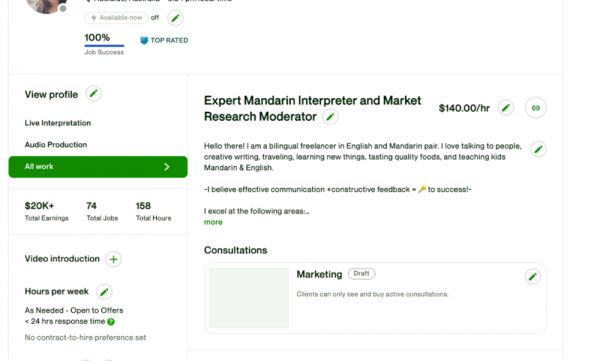 Upwork是全球最大的自由职业平台,拥有1200万注册用户。卓卓(化名)是其中之一,她作为口译员自2021年开始在Upwork上接单。Upwork给卓卓的感觉和淘宝类似,买家(用人方)会到卖家(自由职业者)的主页(店铺)看其提供的产品(技能)、价格以及曾经卖出去的服务、获得的评价。如果店铺一单都没成交过,买家便会有所顾忌。同样,卓卓也可以去到客户的店铺,看之前合作过的自由职业者对其的评价,包括客户好不好沟通、薪水发放是否及时等。和任何一个行业一样,赚第一桶金是最难的。为了累计信誉,卓卓一开始接了几单5美元的生意(一小时5美元是Upwork的最低标准),她帮在中国台湾教中文的美国人录过600个中文字,还做过越南新手人生导师的模拟客户。