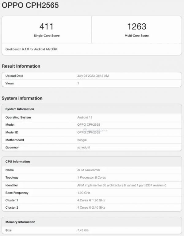 IT之家 7 月 5 日消息,消息称 OPPO 计划 7 月 7 日发布 A78 4G 手机,正式发布之前该机已现身 GeekBench 跑分库,6.1 版本单核成绩为 411 分,多核成绩为 1263 分。