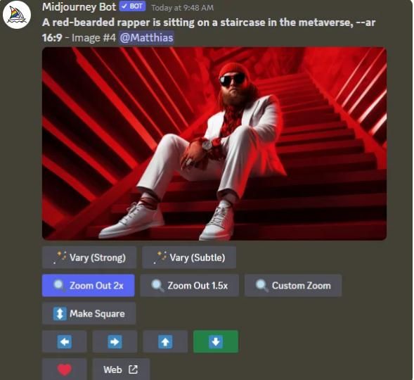 ▲ 图片上下扩展演示,图源 Midjourney 的 Discord 频道在 Remix 模式中,用户可以上传自己的照片,平台将会把照片裁切为 1:1 正方形尺寸,之后便可以输入提示词,创建自己所需要的内容。