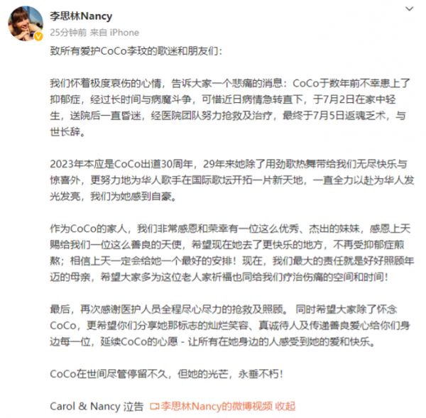 我们怀着极度哀伤的心情,告诉大家一个悲痛的消息:CoCo于数年前不幸患上了抑郁症,经过长时间与病魔斗争,可惜近日病情急转直下,于7月2日在家中轻生,送院后一直昏迷,经医院团队努力抢救及治疗,最终于7月5日返魂乏术,与世长辞。