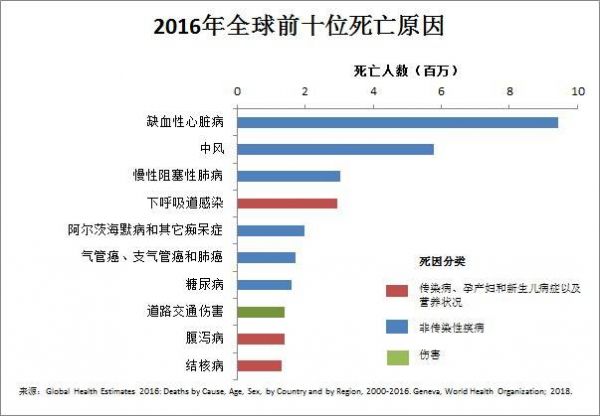 在全球,以2016年为例,全球5690万例死亡中,一半以上(54%)是前十大原因造成的。缺血性心脏病和中风是全球最大的杀手,2016年共造成1520万人死亡,其次是慢阻肺和感染。这些疾病在过去15年中一直是全球主要的死亡原因。