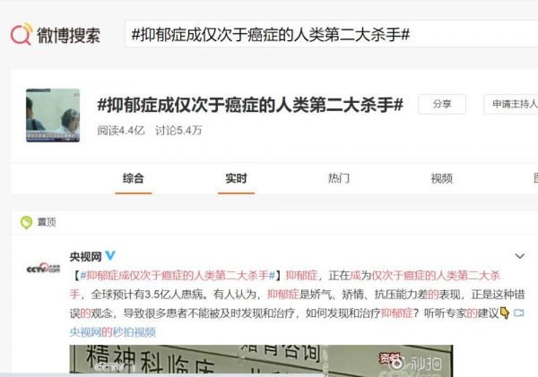 2020年9月12日晚,这条由央视网设置的话题#抑郁症成仅次于癌症的人类第二大杀手#已经成为了微博热搜第一位,阅读3.8亿次,讨论4.3万,隔天阅读数达到4.4亿。