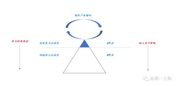 此外,在供给国内,天然存在两个群体,一个群体深度参与全球化,收入水平较高,记为A阶层;另一个群体间接参与全球化,收入水平较低,记为B阶层。
