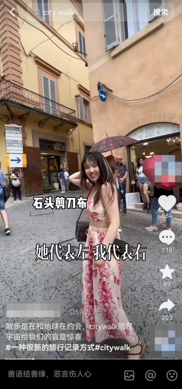 在许多网友的分享中,她们“遇到绿灯就前行,遇到红灯就转弯”,“和朋友石头剪刀布决定往哪个方向走”,不再刻意挤进网红打卡点,追求的就是一种开盲盒般的随性与快乐。