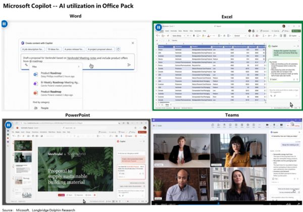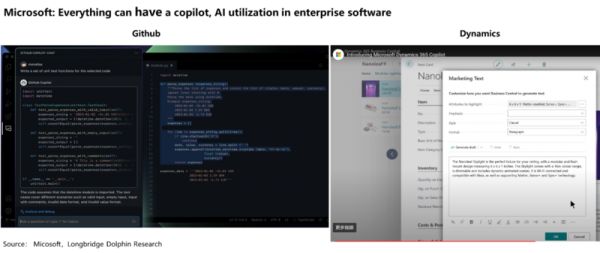 实际除了上述举例外,微软在生产力板块内(P&BP)的其他软件内也普遍都应用了AI,海豚君就不一一描述。概括来看,现阶段AI在生产力软件中的作用,主要集中在两方面:一是减少用户在简单重复工作上的耗费,二是提供文案、方案、代码上初步的建议。
