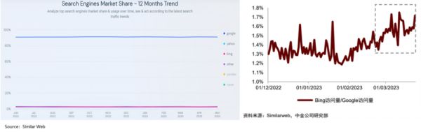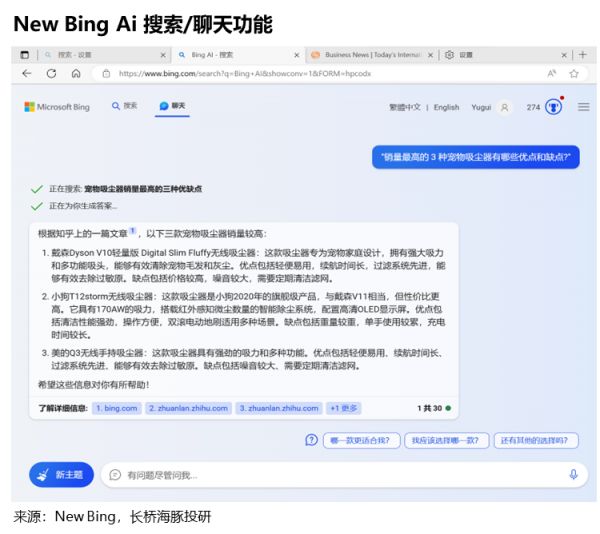 另外,除了在New Bing网页上,微软在Edge的侧边栏也内嵌了AI插件,用户能随时调出AI+搜索等功能,无需先打开搜索网页,当用户使用AI+搜索的频次提升时,会有所削弱搜索网站的入口地位。