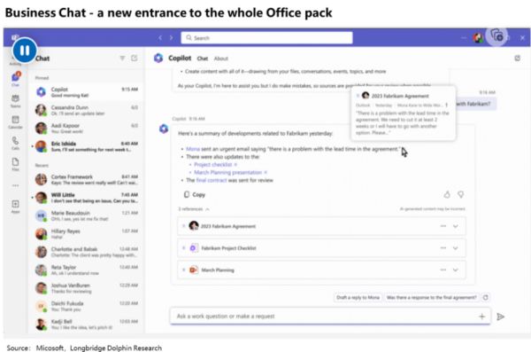 5)Business Chat:除了在Office产品内嵌入AI功能外,微软也新发布了一款据称能成为用户的“私人助手”的软件——Business Chat。类似于Office Copilot,Business Chat也能够进行要点总结,草拟工作流程,自动生成邮件答复、工作模板等功能。不同之处则是,Business Chat能跨软件灵活调用和汇总横跨文档、演示文稿、电子邮件、联系人等各类应用程序的信息,提供全局性的辅助,有可能成为企业办公的新入口。