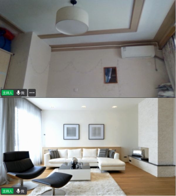 下面这张图,上面是我家客厅,下面是钉钉虚拟背景图,画面风格相似度99.9%,放在一起毫无违和感。才发现,家客厅简直就和钉钉虚拟背景一模一样。