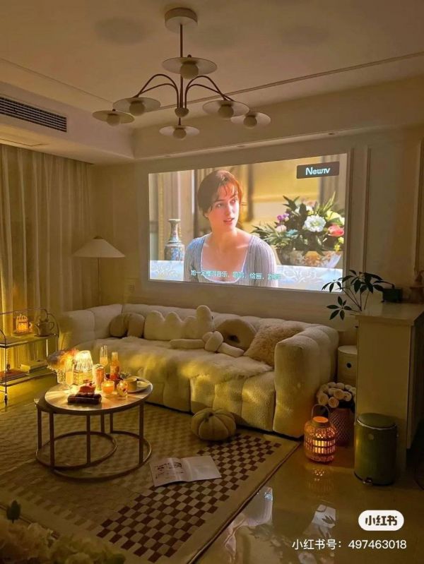 除了电视,客厅有更多灵活的布置。小红书上就有各种氛围感拉满的设计,比如投影仪。