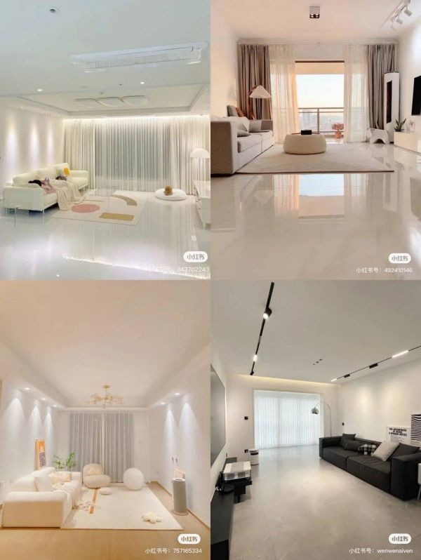 每个装修案例,给人的感觉就是:干净、明亮、整洁。墙面、地面统一白灰色调,客厅空无一物,只有地毯、沙发和必要的灯具。