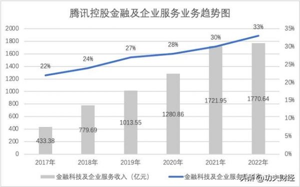 图源:Wind财报显示,2015年-2020年,腾讯金融科技和企业服务业务的毛利率从10%提升至28%,五年时间增长13个百分点。2022年,腾讯金融科技和企业服务业务毛利为583.74亿元,毛利率为33%,对比上年的513.96亿元,增长13.58%。