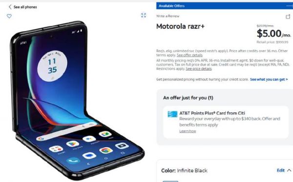 附:在欧美运营商的营业厅或官网,类似的优惠购机服务很常见。例如在at&t官网购买摩托罗拉 razr+ 。