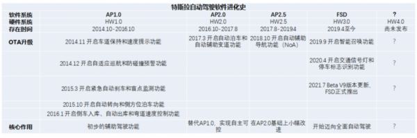 特斯拉自动驾驶最大的特色就是软硬结合,或者说硬件先行,软件升级。最早与Mobileye合作时,对应的是AP1.0,一直到与英伟达合作的AP2.5,本质上都是驾驶辅助系统,就是我们常说的L2级别。直到2019年4月,特斯拉HW3.0上线,AP才正式全面升级为FSD,也就是L4级别的自动驾驶系统。