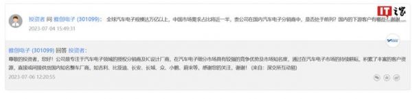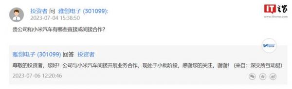 雅创电子 7 月 4 日在投资者互动平台表示,公司与小米汽车间接开展业务合作,现处于小批阶段。