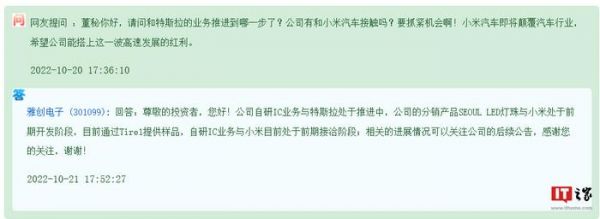 2022 年 10 月,雅创电子还透露,该公司的分销产品 SEOUL LED 灯珠与小米处于前期开发阶段,已通过 Tire1 提供样品,自研 IC 业务与小米处于前期接洽阶段。