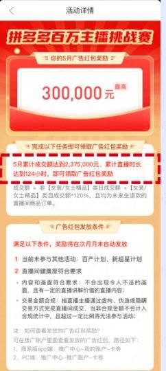 根据介绍,百万主播挑战赛的目标是帮助直播商家进一步提升直播GMV,平台每月会为主播设置同比值(一般为商家直播GMV环比增量数据),店铺按照目标完成后,平台会在次月发广告红包奖励,参与活动的主播和商家每月最高可获取30万元广告红包。