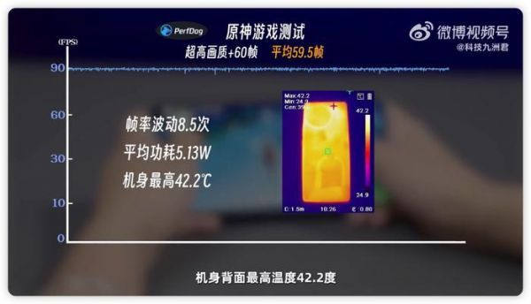 至于原神,30分钟最高画质60帧,须弥跑图测试,平均帧率为59.5帧,这个表现在帧率图上看基本就是一条毫无波动的直线,几乎就是顶着60帧跑。功耗为5.13瓦,机身背面最高温度42.2度,手掌的感觉也就是温热。