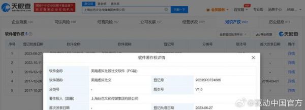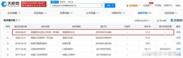 7月6日消息,天眼查App显示,近日,上海丝芭文化传媒集团有限公司“美踏虚拟社区社交软件(PC端)”著作权获得登记批准,软件简称为“美踏虚拟社交”,当前版本号为V1.0。据此前媒体报道,去年6月,丝芭传媒重组核心业务和企业构架,控股公司更名为美踏控股,核心业务转型为面向WEB3.0和XR互联网时代的沉浸式互动社交元宇宙——美踏元宇宙。目前,“美踏元宇宙”网页及客户端已上线。