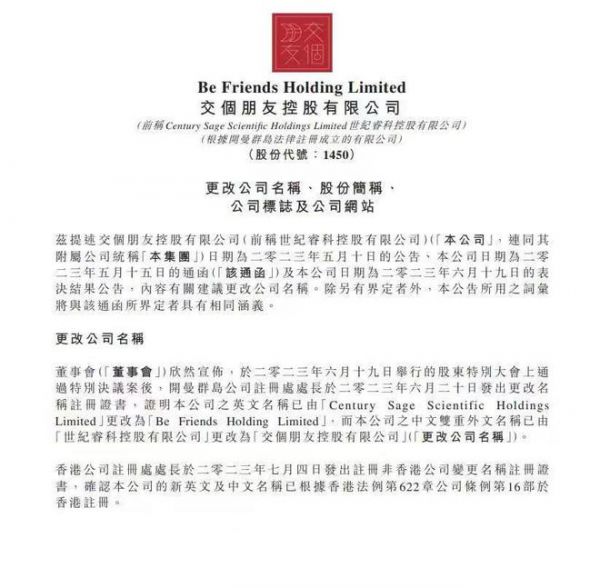7月6日晚,港股公司世纪睿科发布公告,公司用作于联交所进行证券买卖的英文及中文股份简称分别将由“CENTURY SAGE”及“世纪睿科”更改为“BE FRIENDS HLDG”及“交个朋友控股”,自2023年7月11日上午9时起生效。