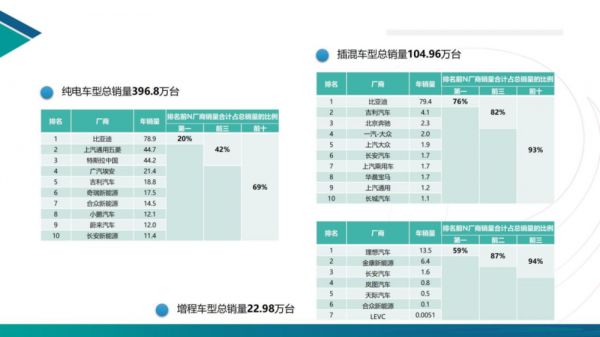 在纯电车型中,集中度还好,第一名、前三名和前十名分别占比20%、42%和69%。