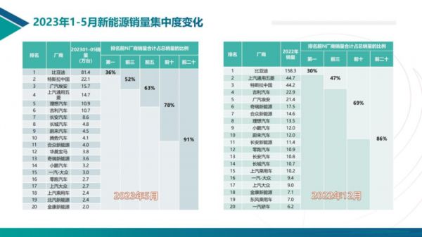 李金勇对比了2022年底的统计:去年前20名市占率是86%,今年前5月是91%;前10名去年69%,今年78%;前三名和第一名市占率也分别提升了5个百分点和6个百分点。