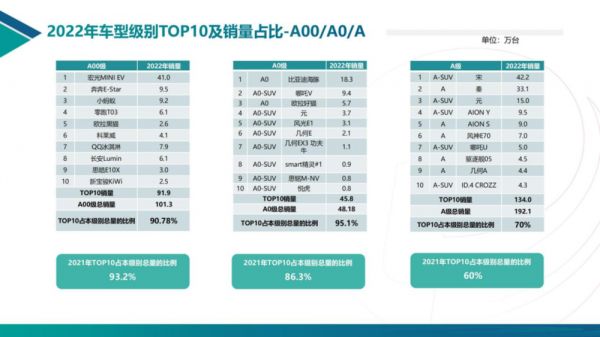 在A00、A0市场,也都出现了很高的集中度。像A00市场,前十的车型占超过90%市场,宏光MINI一个车型就占了40%左右份额。