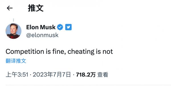 Threads 上线至今,马斯克一直保持沉默,直到北京时间今日凌晨发布了一条 Twitter:竞争有利,作弊不好。可以说相当克制了。
